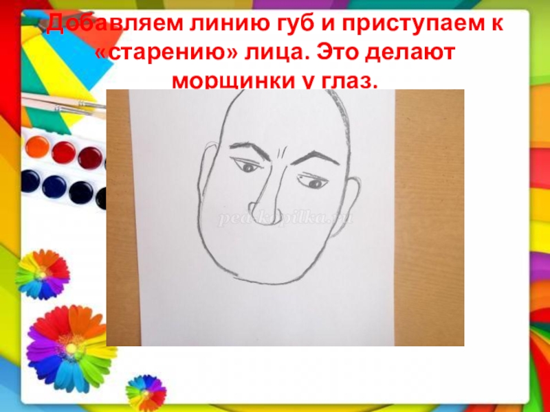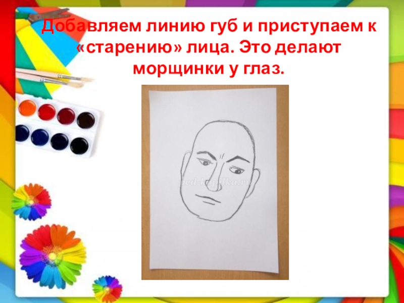 Слайд 8Добавляем линию губ и приступаем к «старению» лица. Это делают морщинки