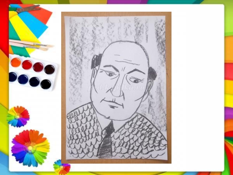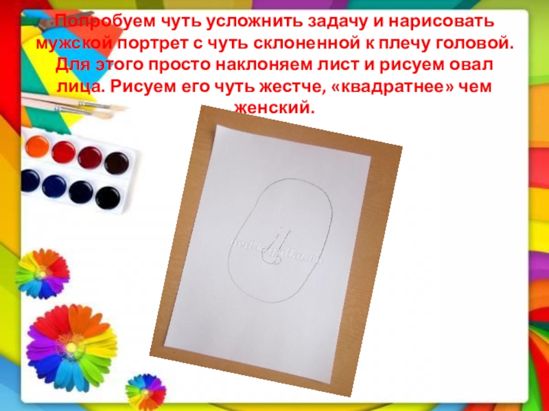 Слайд 4Попробуем чуть усложнить задачу и нарисовать мужской портрет с чуть склоненной