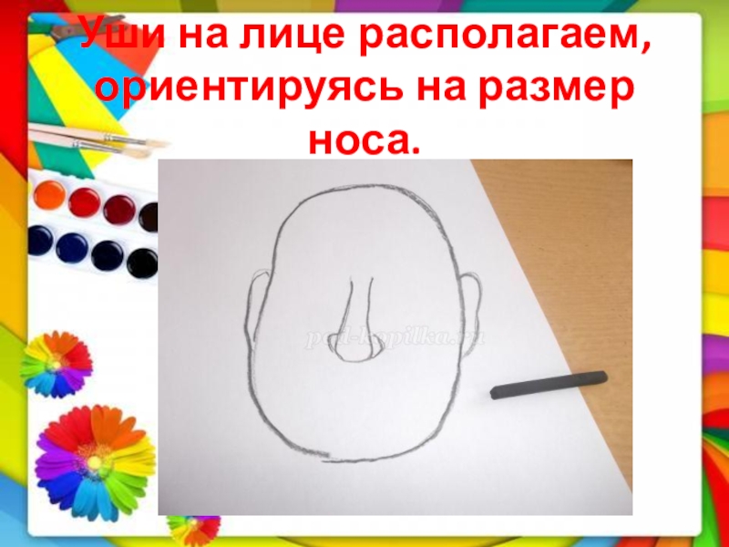 Слайд 6Уши на лице располагаем, ориентируясь на размер носа.