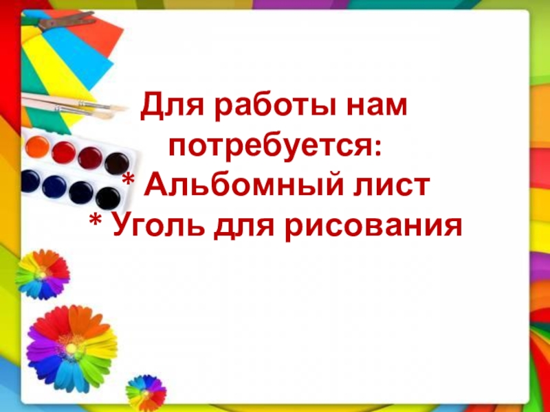 Слайд 2Для работы нам потребуется: * Альбомный лист * Уголь для рисования