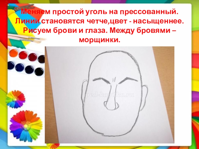 Слайд 7Меняем простой уголь на прессованный. Линии становятся четче,цвет - насыщеннее. Рисуем брови