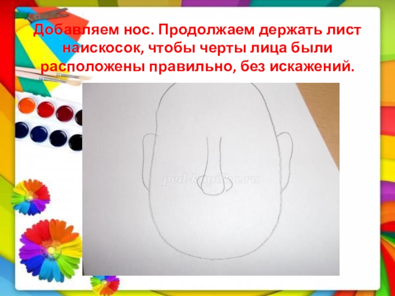 Слайд 5Добавляем нос. Продолжаем держать лист наискосок, чтобы черты лица были расположены