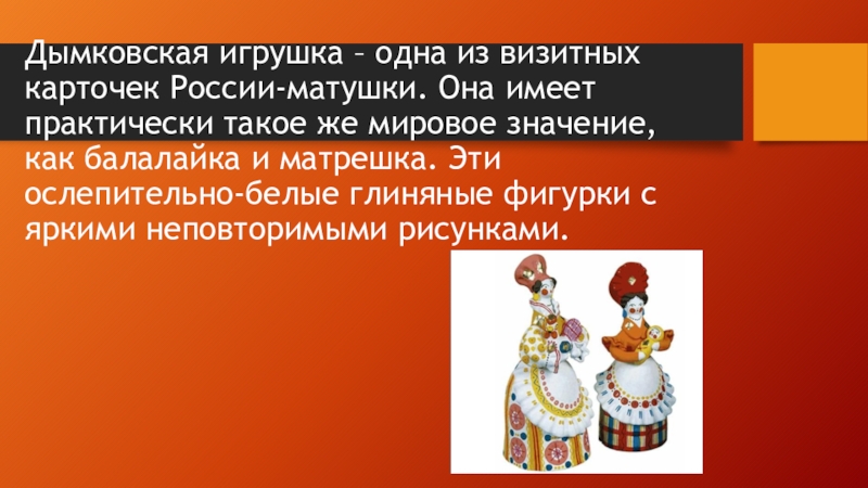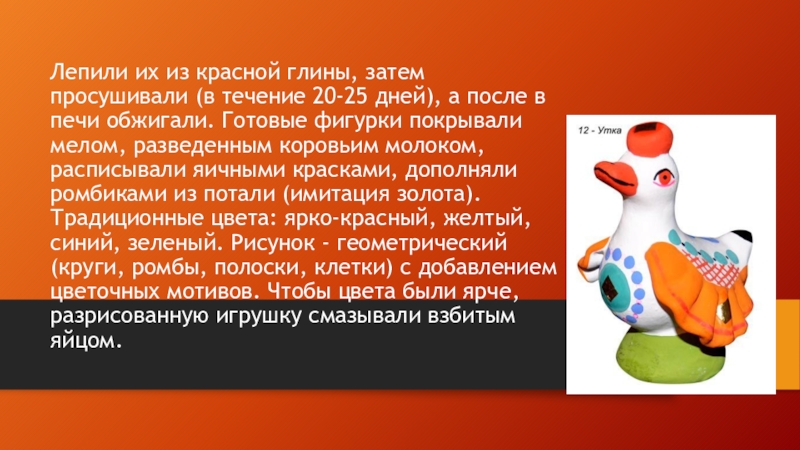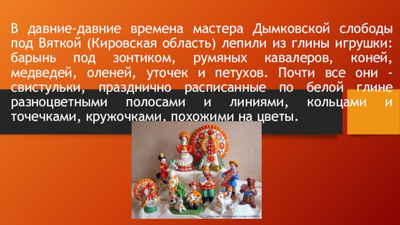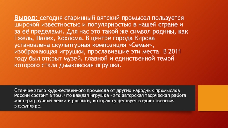 Отличие этого художественного промысла от других народных промыслов России состоит в том, что каждая игрушка - это авторская творческая работа мастериц ручной лепки и росписи, которая существует в единственном экземпляре.