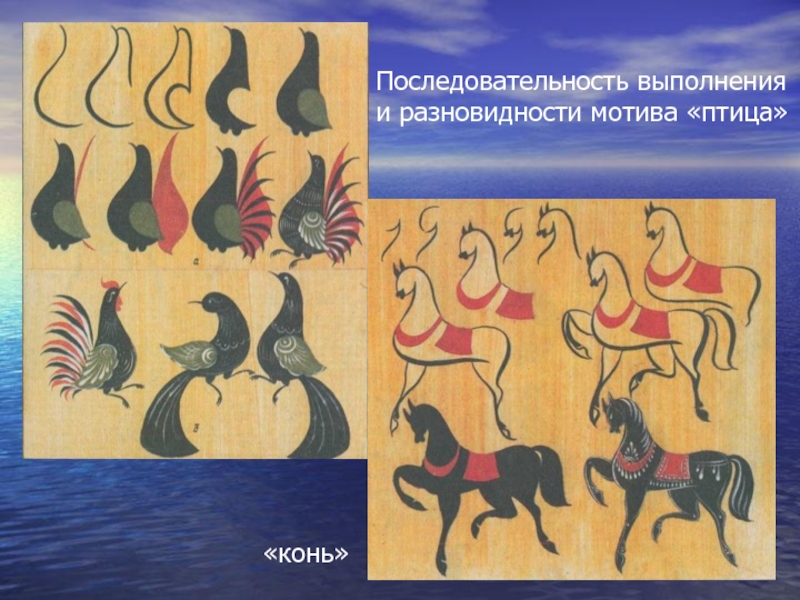 Последовательность выполненияи разновидности мотива «птица»«конь»