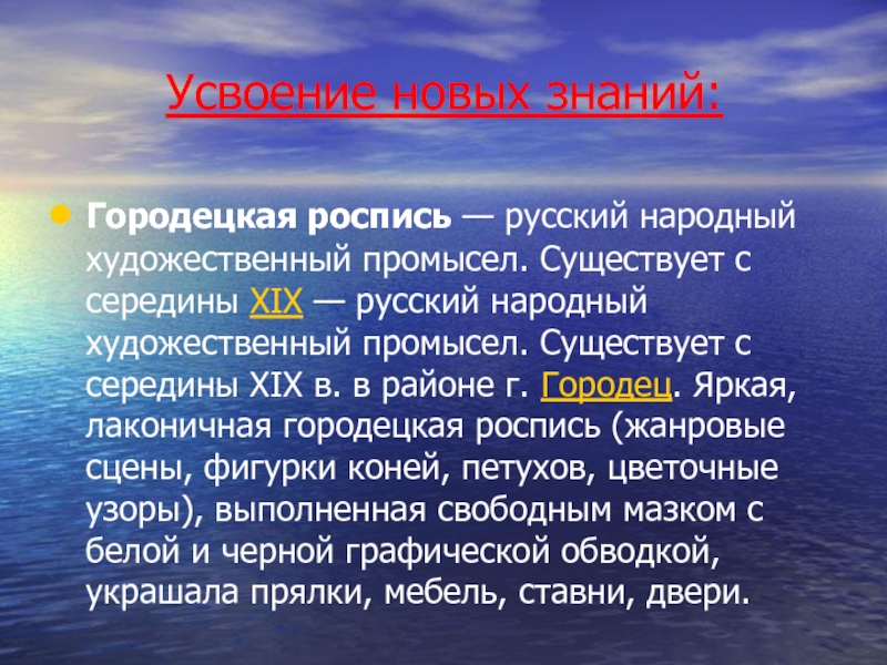 Усвоение новых знаний:Городецкая роспись — русский народный художественный промысел. Существует с середины XIX — русский народный художественный промысел. Существует