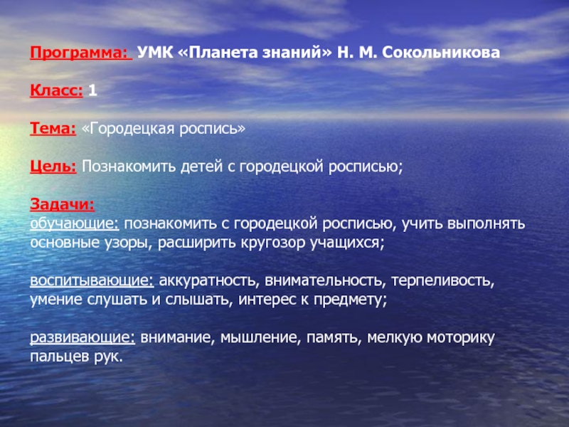 Слайд 2 Программа: УМК «Планета знаний» Н. М. Сокольникова Класс: 1 Тема: «Городецкая роспись» Цель: Познакомить