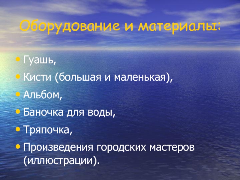 Оборудование и материалы:Гуашь,Кисти (большая и маленькая),Альбом,Баночка для воды,Тряпочка,Произведения городских мастеров (иллюстрации).