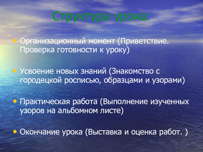 Структура урока:Организационный момент (Приветствие. Проверка готовности к уроку)Усвоение новых знаний (Знакомство с городецкой росписью, образцами и узорами)Практическая