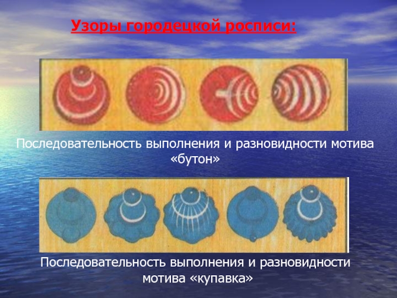 Последовательность выполнения и разновидности мотива «бутон»Последовательность выполнения и разновидности мотива «купавка»Узоры городецкой росписи: