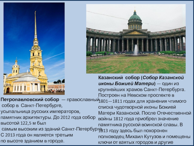 Казанский собор (Собор Казанской иконы Божией Матери) — один из крупнейших храмов Санкт-Петербурга. Построен на Невском проспекте в 1801—1811 годах для хранения чтимого списка чудотворной иконы Божией Матери Казанской. После Отечественной войны 1812 года приобрел значение памятника русской воинской славы. В 1813 году здесь был похоронен полководец Михаил Кутузов и помещены ключи от взятых городов и другие военные трофеи.