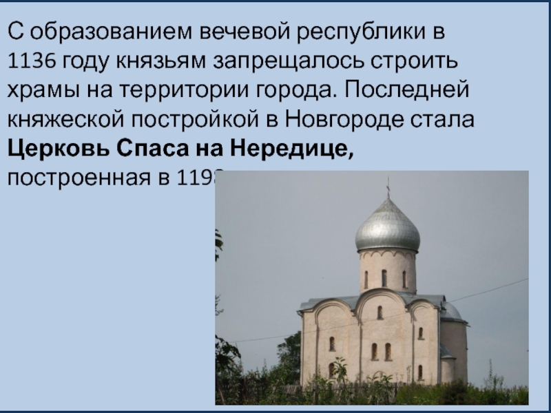 С образованием вечевой республики в 1136 году князьям запрещалось строить храмы