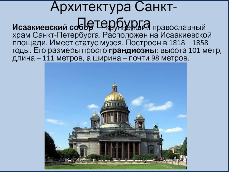 Исаакиевский собор — крупнейший православный храм Санкт-Петербурга. Расположен на Исаакиевской