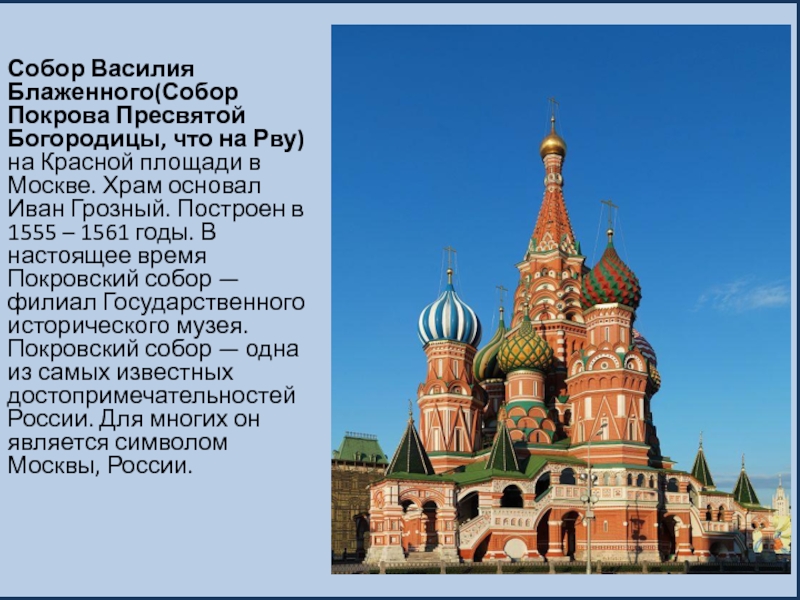 площади в Москве. Храм основал Иван Грозный. Построен в 1555 – 1561 годы. В настоящее время Покровский собор — филиал Государственного исторического музея. Покровский собор — одна из самых известных достопримечательностей России. Для многих он является символом Москвы, России.