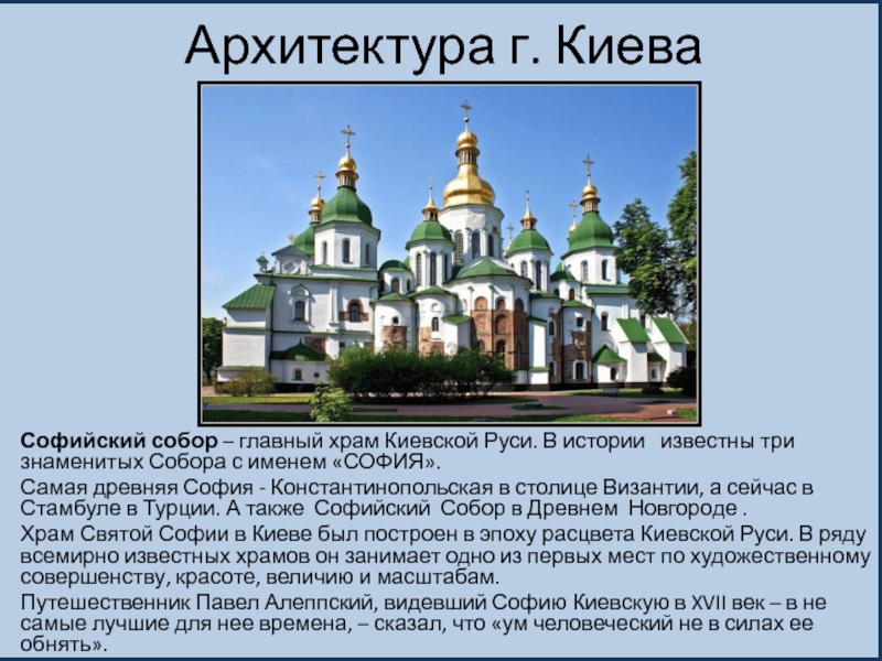 Храм Святой Софии в Киеве был построен в эпоху расцвета Киевской Руси. В ряду всемирно известных храмов он занимает одно из первых мест по художественному совершенству, красоте, величию и масштабам.