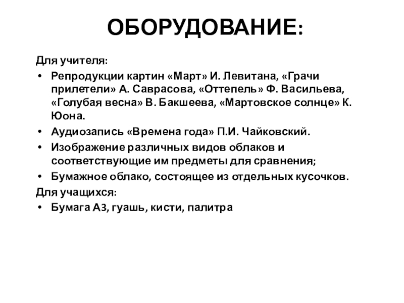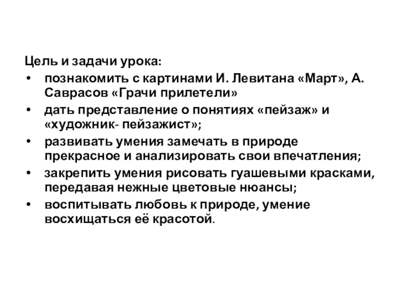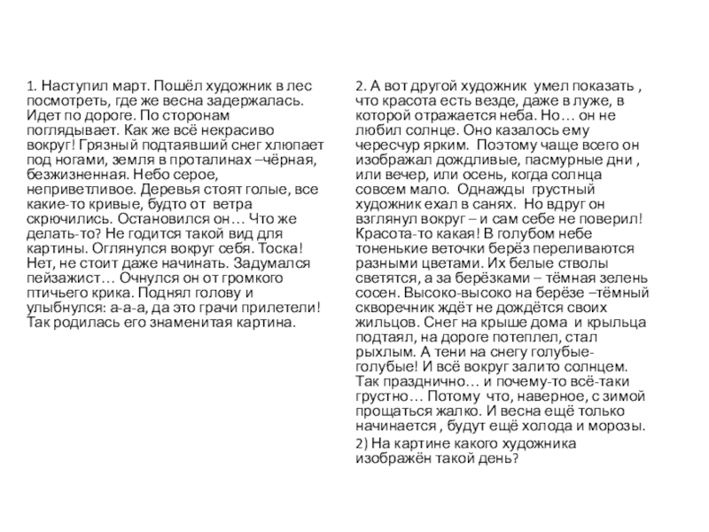 2. А вот другой художник умел показать , что красота есть везде, даже в луже, в которой отражается неба. Но… он не любил солнце. Оно казалось ему чересчур ярким. Поэтому чаще всего он изображал дождливые, пасмурные дни , или вечер, или осень, когда солнца совсем мало. Однажды грустный художник ехал в санях. Но вдруг он взглянул вокруг – и сам себе не поверил! Красота-то какая! В голубом небе тоненькие веточки берёз переливаются разными цветами. Их белые стволы светятся, а за берёзками – тёмная зелень сосен. Высоко-высоко на берёзе –тёмный скворечник ждёт не дождётся своих жильцов. Снег на крыше дома и крыльца подтаял, на дороге потеплел, стал рыхлым. А тени на снегу голубые-голубые! И всё вокруг залито солнцем. Так празднично… и почему-то всё-таки грустно… Потому что, наверное, с зимой прощаться жалко. И весна ещё только начинается , будут ещё холода и морозы.