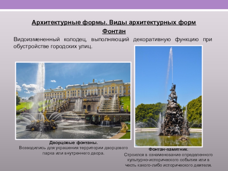 Возводились для украшения территории дворцового парка или внутреннего двора.