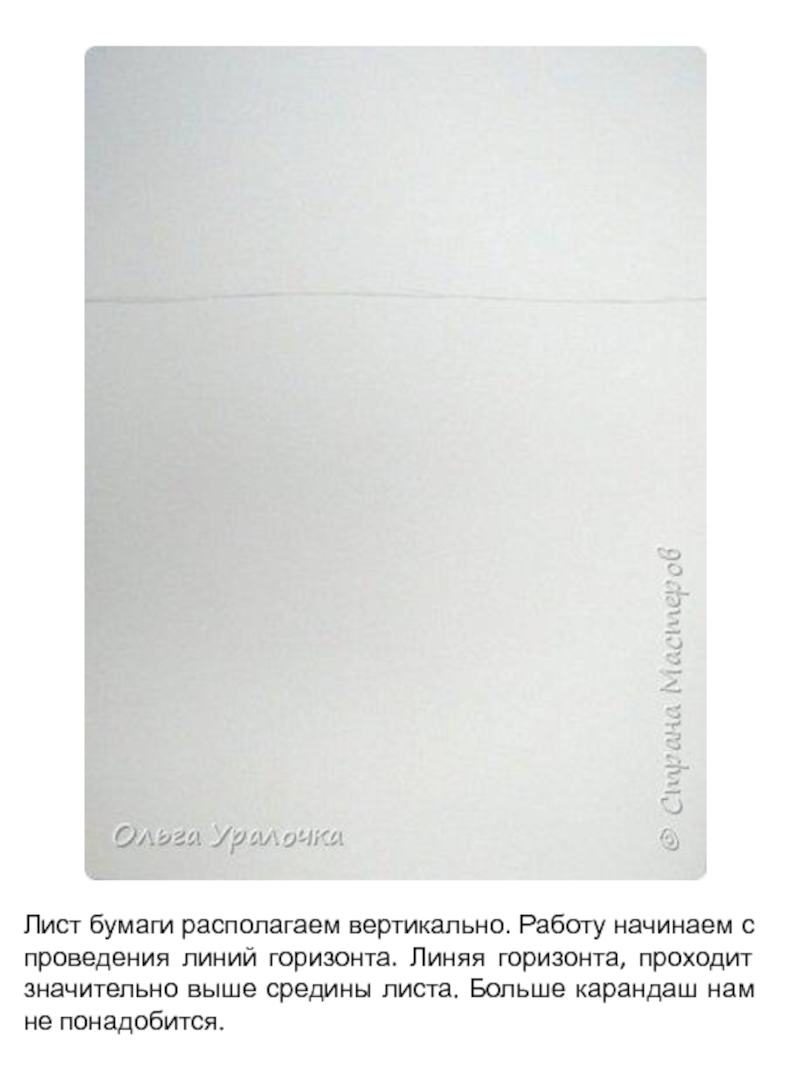 Лист бумаги располагаем вертикально. Работу начинаем с проведения линий горизонта. Линяя горизонта, проходит значительно выше средины листа.