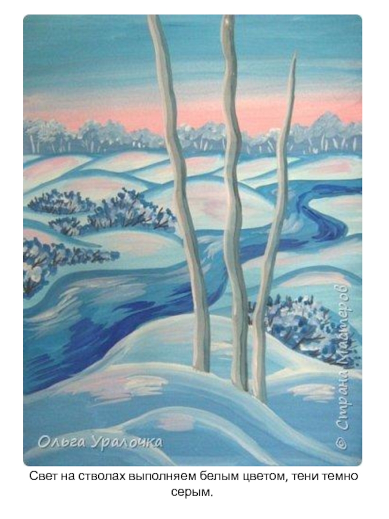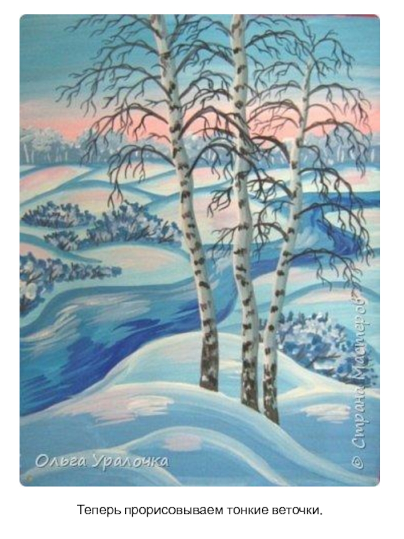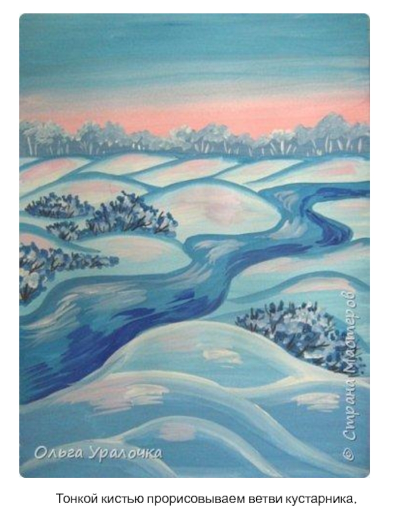 Слайд 17В дали на вершинах холмов, намечаем цветом силуэты заснеженных кустов.