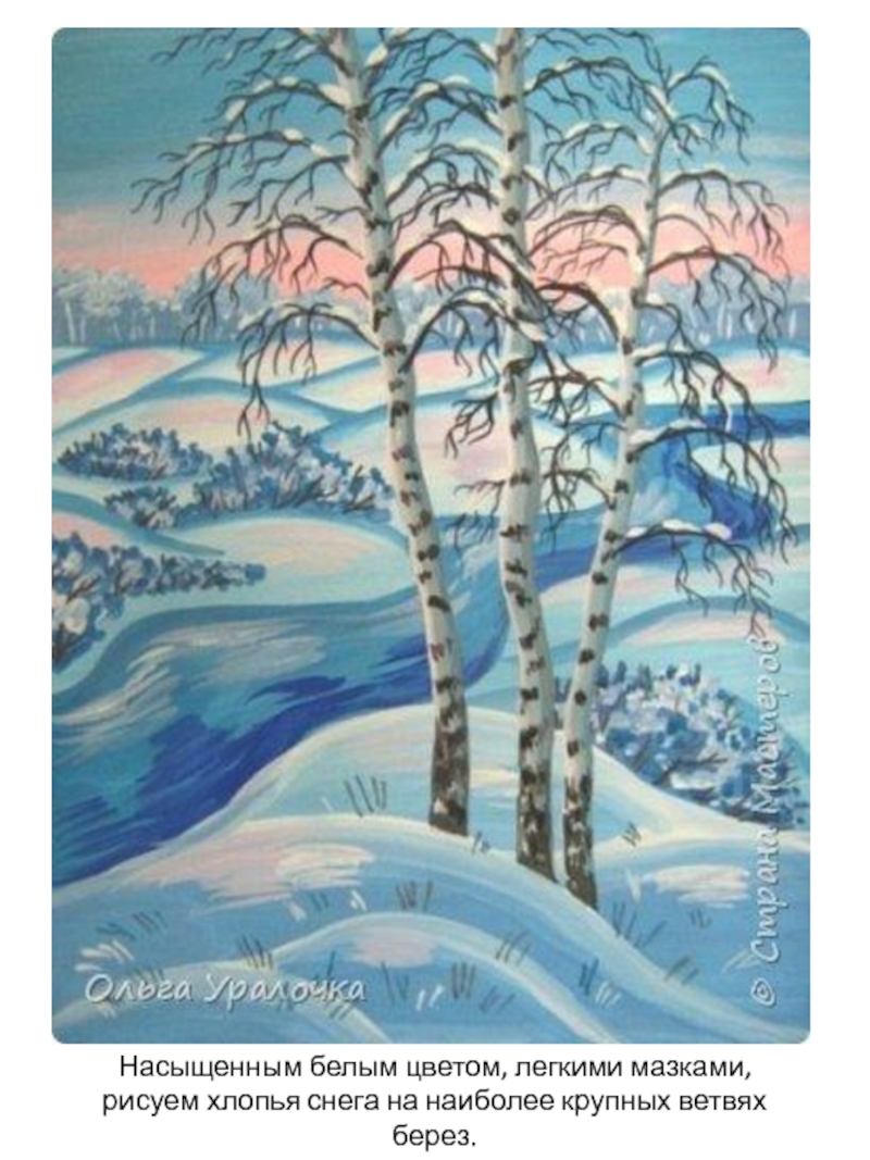 Слайд 28Насыщенным белым цветом, легкими мазками, рисуем хлопья снега на наиболее крупных