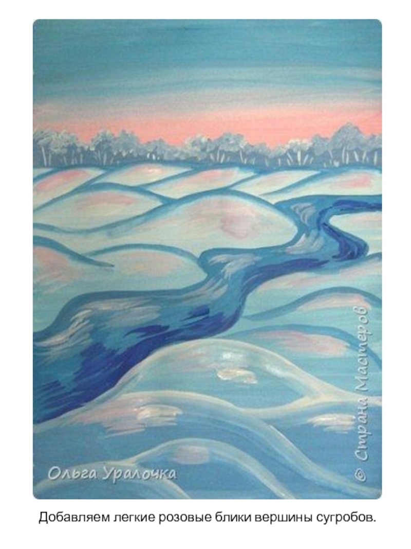 Слайд 16Добавляем легкие розовые блики вершины сугробов.