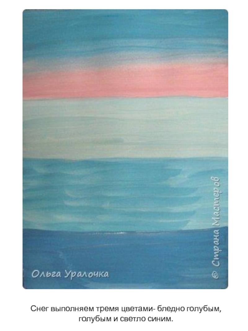 Слайд 6Снег выполняем тремя цветами- бледно голубым, голубым и светло синим.