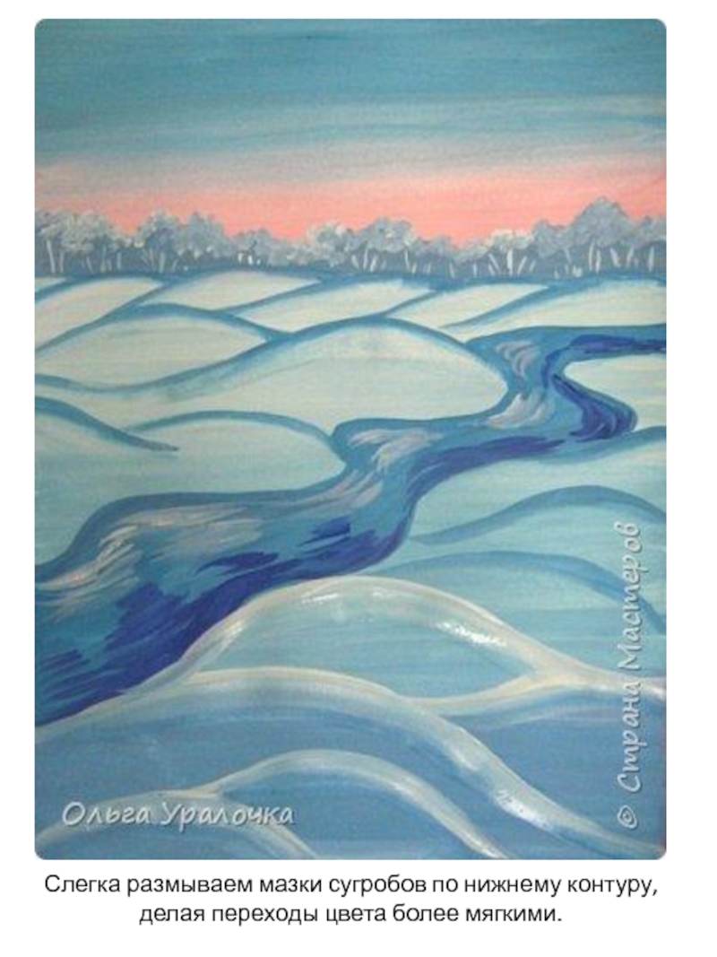 Слегка размываем мазки сугробов по нижнему контуру, делая переходы цвета более мягкими.