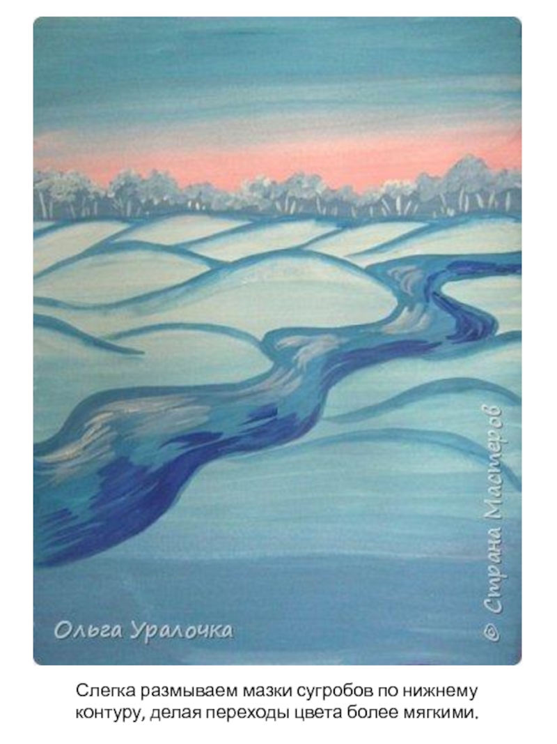 Слайд 13Слегка размываем мазки сугробов по нижнему контуру, делая переходы цвета более