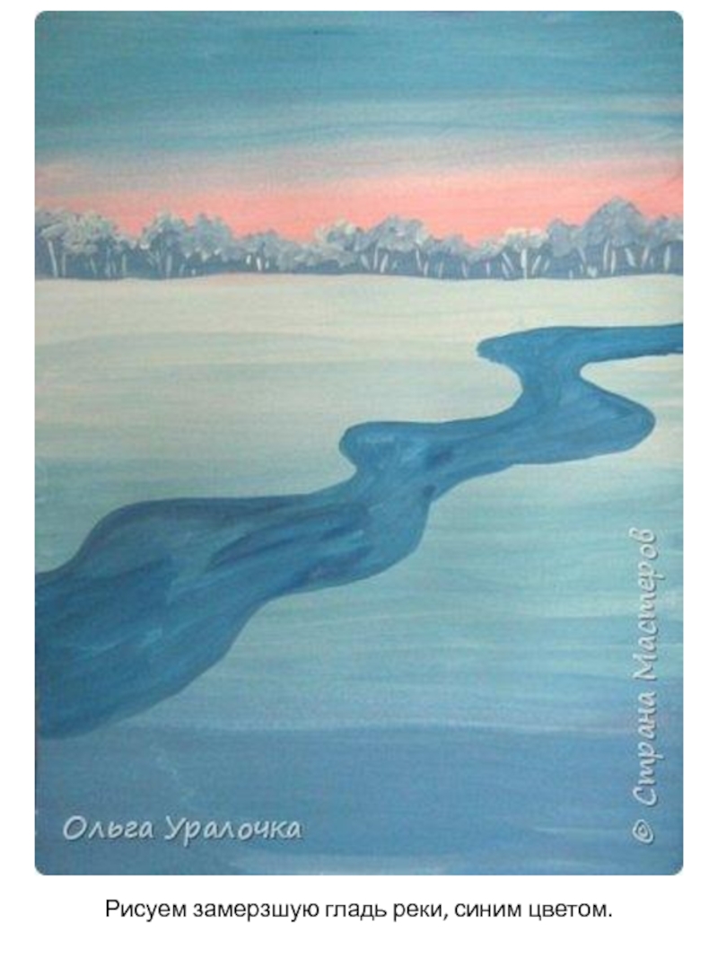Слайд 10Рисуем замерзшую гладь реки, синим цветом.
