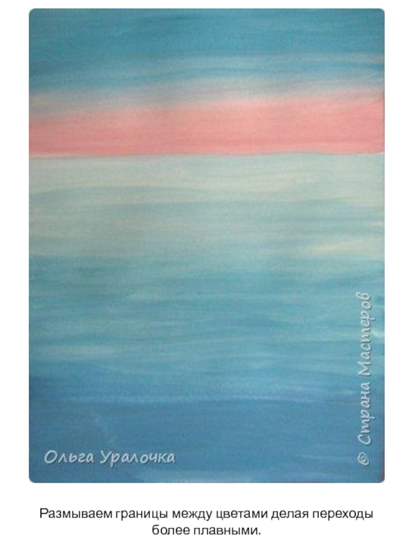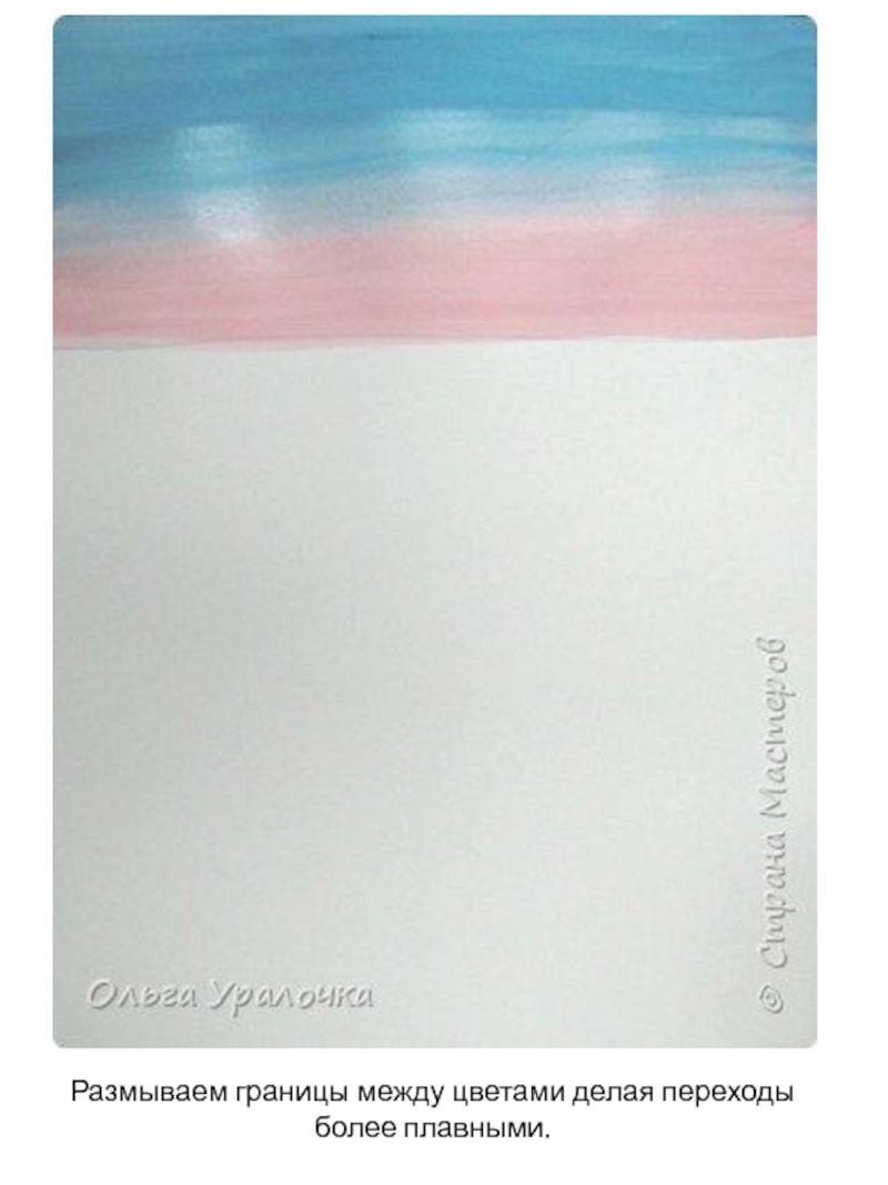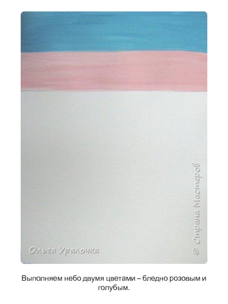 Слайд 4Выполняем небо двумя цветами – бледно розовым и голубым.