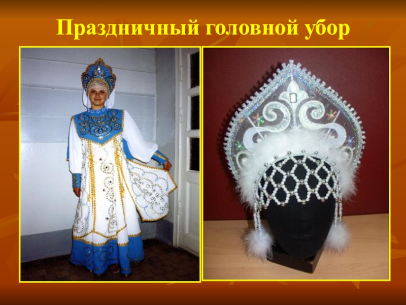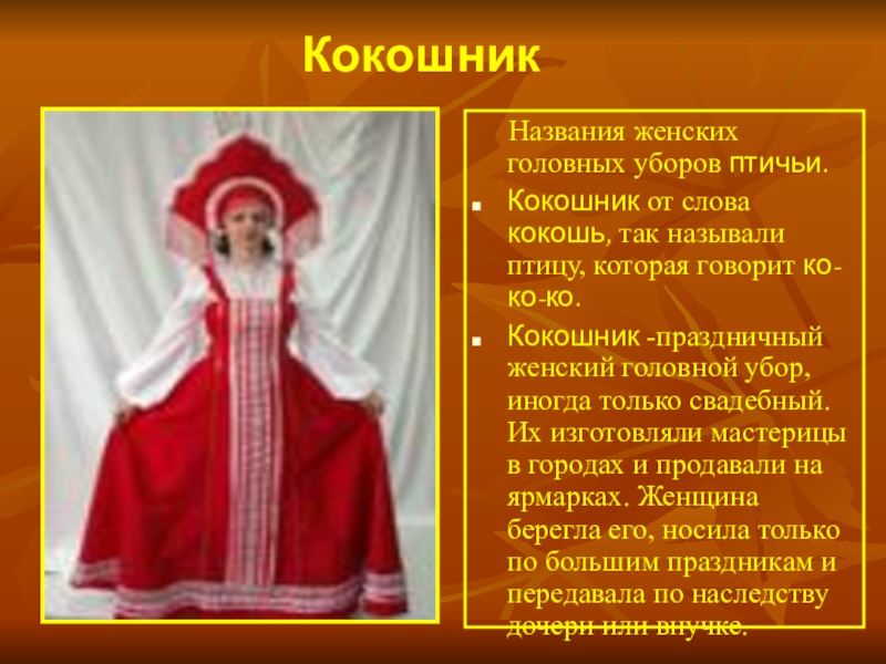 Кокошник -праздничный женский головной убор, иногда только свадебный. Их изготовляли мастерицы в городах и продавали на ярмарках. Женщина берегла его, носила только по большим праздникам и передавала по наследству дочери или внучке.