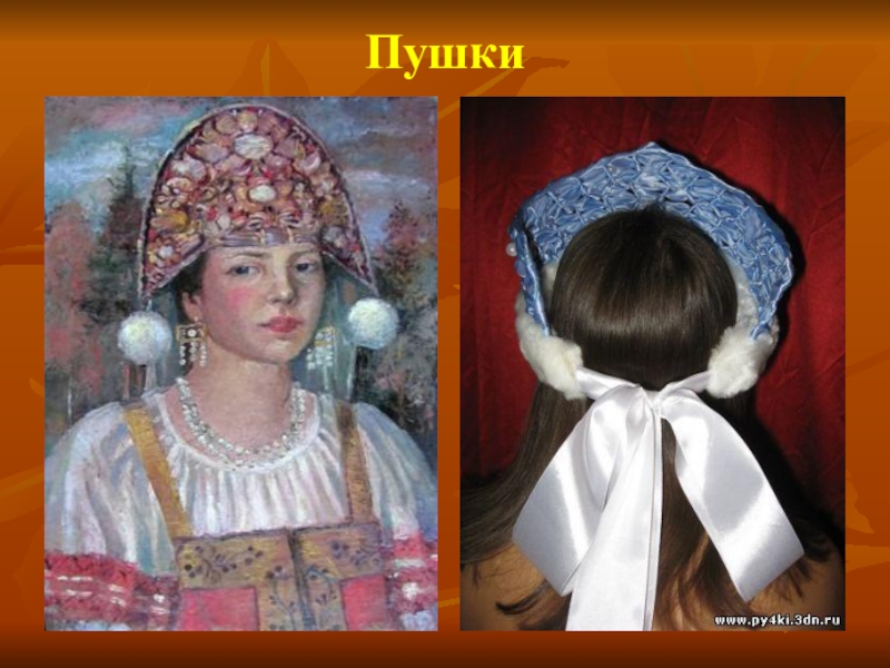 Использовались в головных уборах и пушки –шарики из гусиного или лебединого пуха. Девушки носили их с лентами.