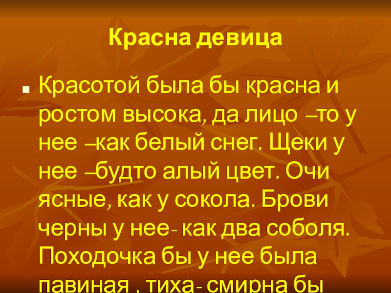 у нее –как белый снег. Щеки у нее –будто алый цвет. Очи ясные, как у сокола. Брови черны у нее- как два соболя. Походочка бы у нее была павиная , тиха- смирна бы речь лебединая.