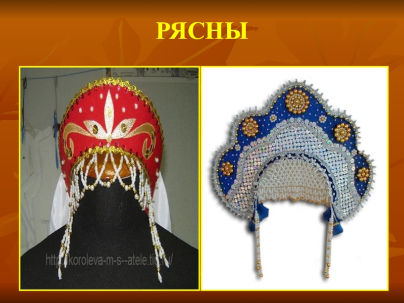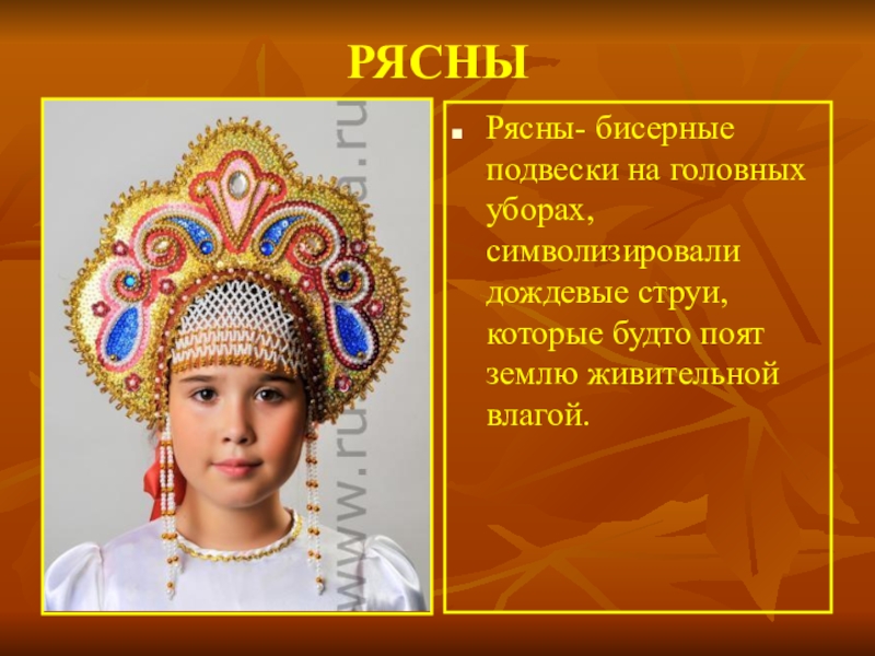 Рясны- бисерные подвески на головных уборах, символизировали дождевые струи, которые будто