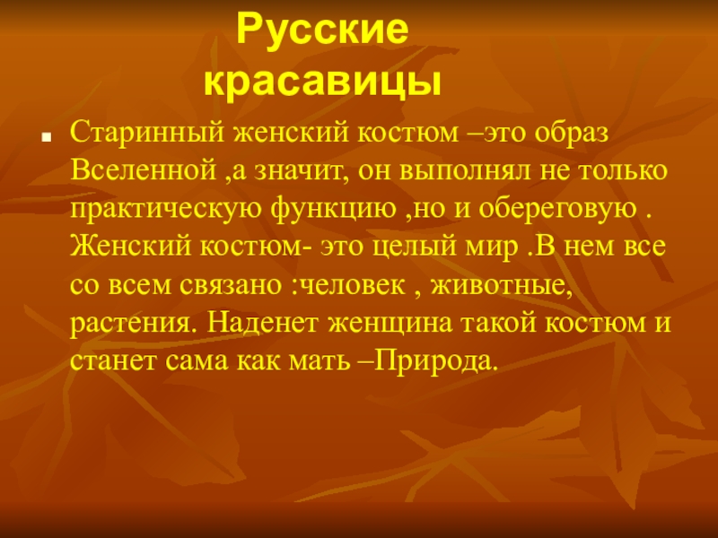 Старинный женский костюм –это образ Вселенной ,а значит, он выполнял