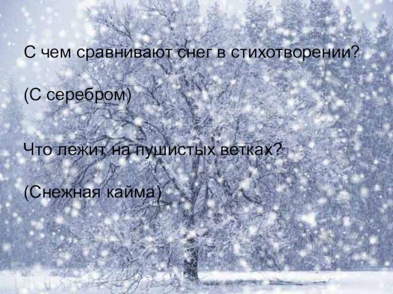 С чем сравнивают снег в стихотворении?Что лежит на пушистых ветках?(С серебром)(Снежная кайма)