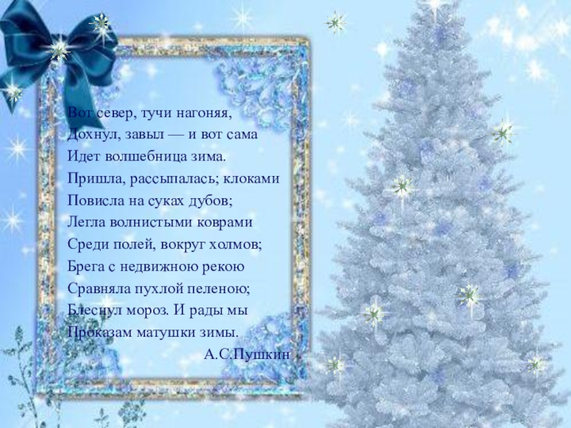Вот север, тучи нагоняя, Дохнул, завыл — и вот сама Идет волшебница зима. Пришла, рассыпалась; клоками Повисла на суках дубов; Легла волнистыми коврами Среди полей, вокруг холмов; Брега с недвижною рекою Сравняла пухлой пеленою; Блеснул мороз.