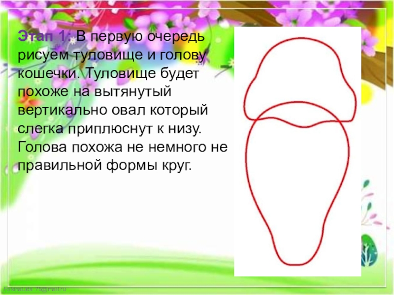 Слайд 4Этап 1: В первую очередь рисуем туловище и голову кошечки. Туловище