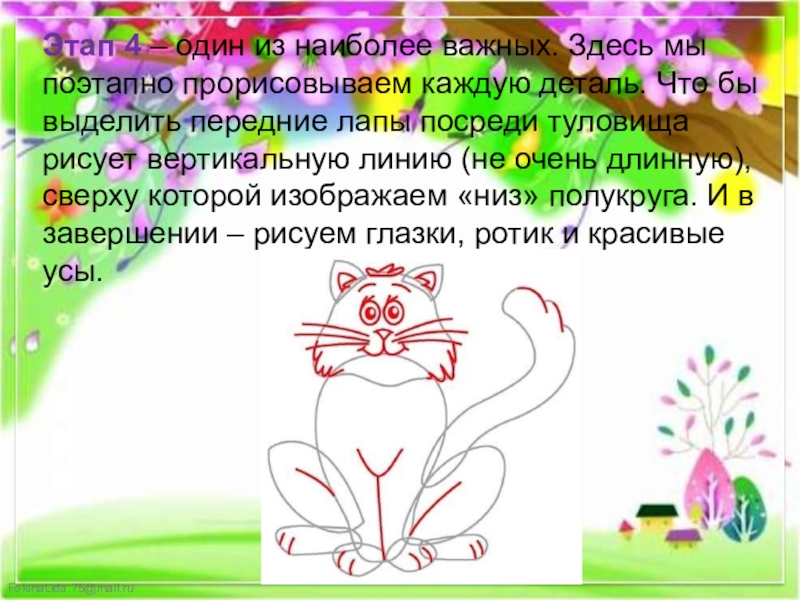 каждую деталь. Что бы выделить передние лапы посреди туловища рисует вертикальную линию (не очень длинную), сверху которой изображаем «низ» полукруга. И в завершении – рисуем глазки, ротик и красивые усы.