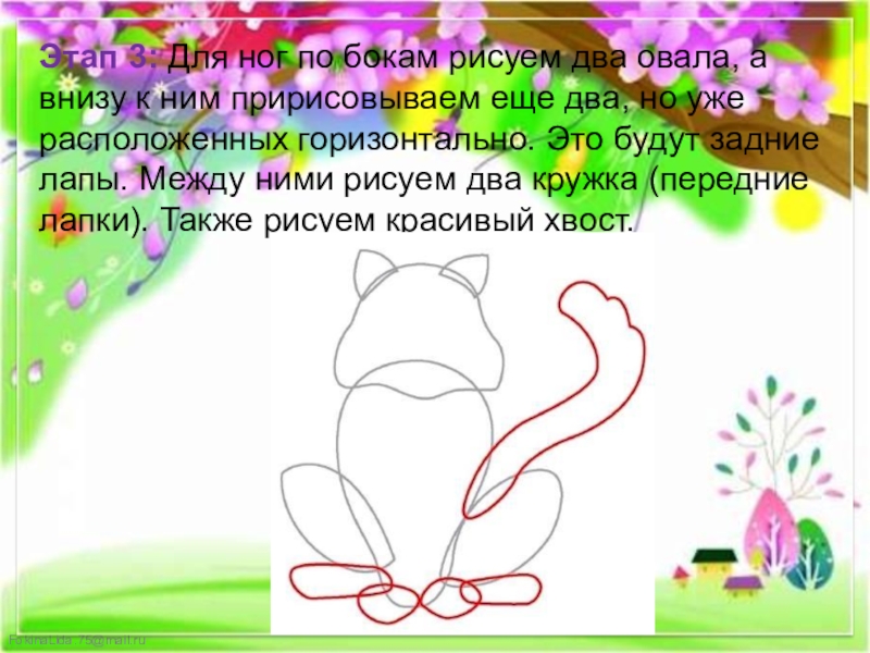 к ним пририсовываем еще два, но уже расположенных горизонтально. Это будут задние лапы. Между ними рисуем два кружка (передние лапки). Также рисуем красивый хвост.