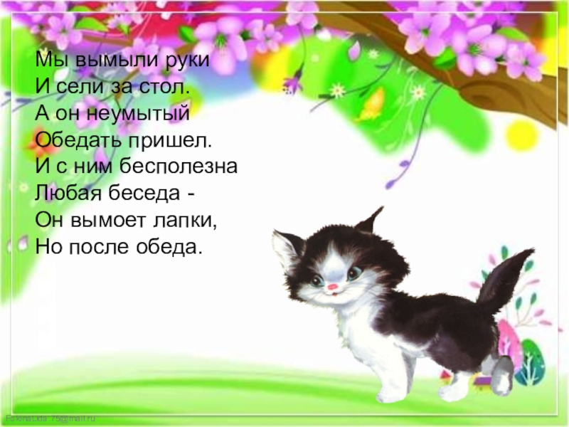 Мы вымыли руки И сели за стол. А он неумытый Обедать пришел. И с ним бесполезна Любая беседа - Он вымоет лапки, Но после обеда.
