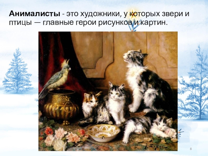 Слайд 8Анималисты - это художники, у которых звери и птицы — главные