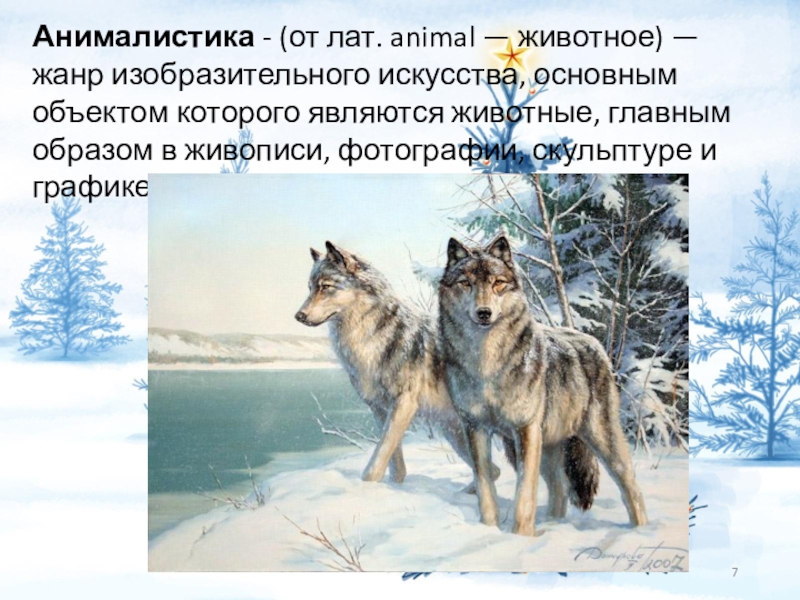 Слайд 7Анималистика - (от лат. animal — животное) — жанр изобразительного искусства,