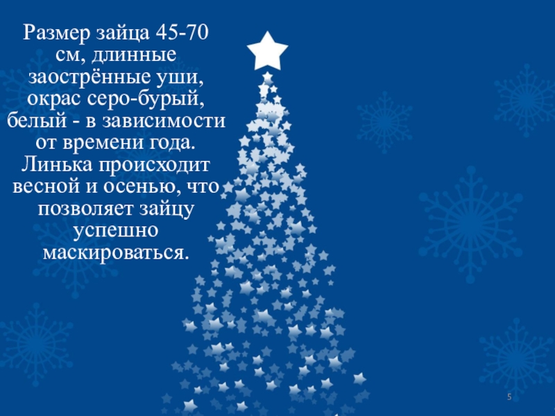 Слайд 5Размер зайца 45-70 см, длинные заострённые уши, окрас серо-бурый, белый -