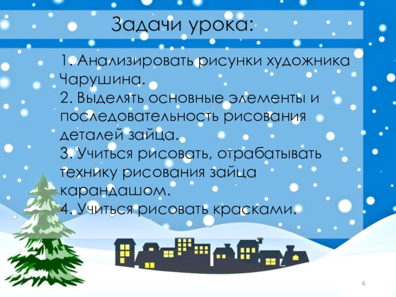Задачи урока:1. Анализировать рисунки художника Чарушина.2. Выделять основные элементы и последовательность рисования деталей зайца.3. Учиться рисовать, отрабатывать