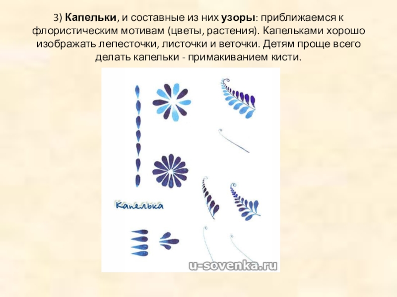 Слайд 63) Капельки, и составные из них узоры: приближаемся к флористическим мотивам (цветы, растения).