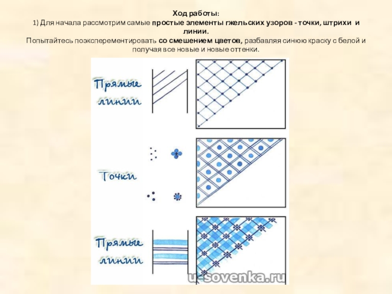 Ход работы: 1) Для начала рассмотрим самые простые элементы гжельских узоров - точки, штрихи  и линии.