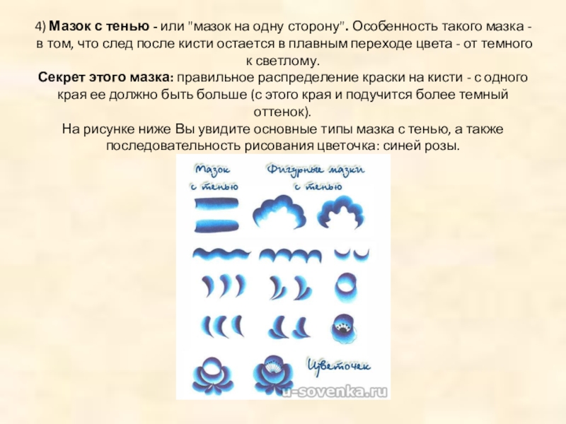 в том, что след после кисти остается в плавным переходе цвета - от темного к светлому.   Секрет этого мазка: правильное распределение краски на кисти - с одного края ее должно быть больше (с этого края и подучится более темный оттенок). На рисунке ниже Вы увидите основные типы мазка с тенью, а также последовательность рисования цветочка: синей розы.