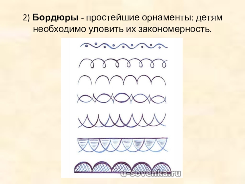 2) Бордюры - простейшие орнаменты: детям необходимо уловить их закономерность.