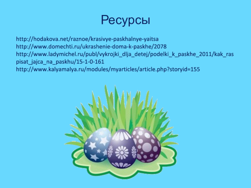 Ресурсыhttp://hodakova.net/raznoe/krasivye-paskhalnye-yaitsahttp://www.domechti.ru/ukrashenie-doma-k-paskhe/2078http://www.ladymichel.ru/publ/vykrojki_dlja_detej/podelki_k_paskhe_2011/kak_raspisat_jajca_na_paskhu/15-1-0-161http://www.kalyamalya.ru/modules/myarticles/article.php?storyid=155