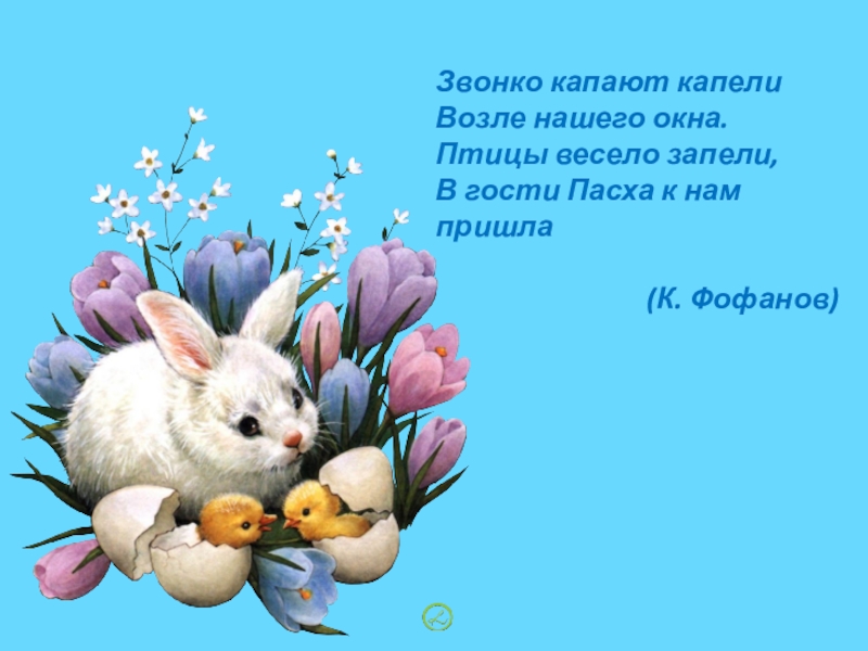 Звонко капают капелиВозле нашего окна.Птицы весело запели,В гости Пасха к нам пришла (К. Фофанов)